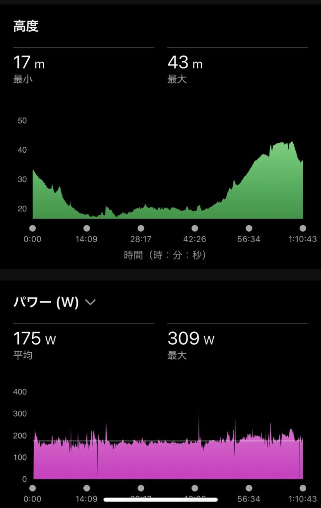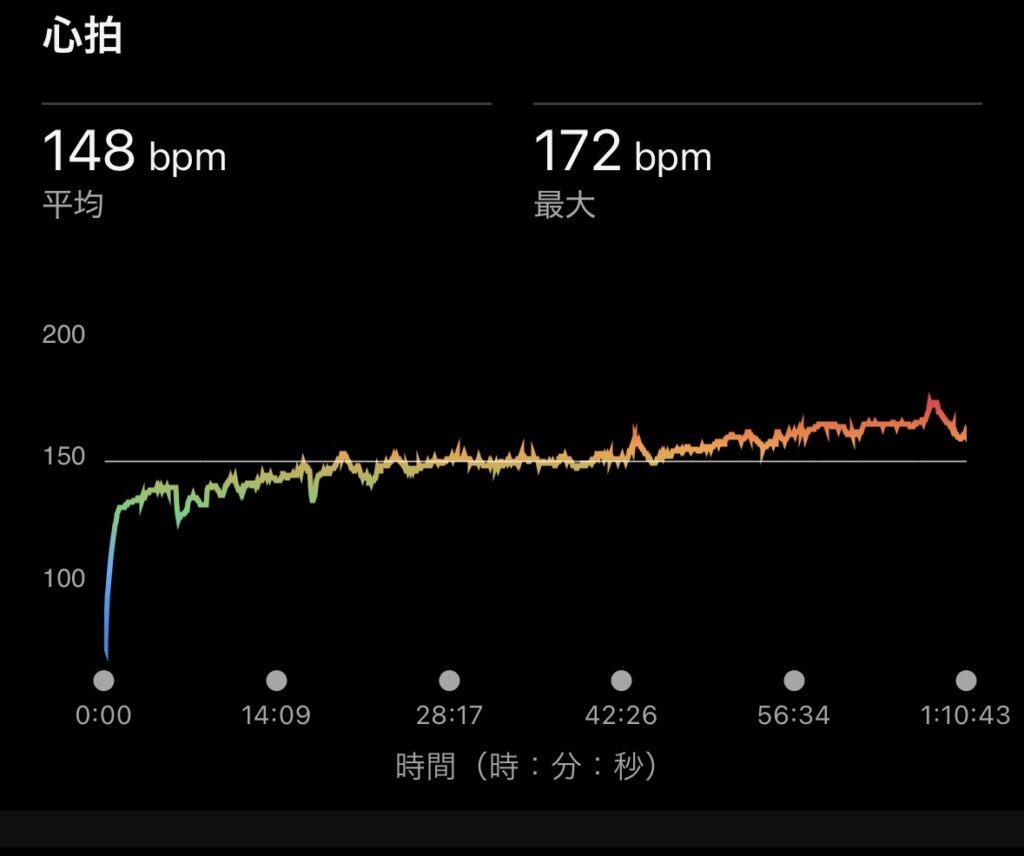 上げたタイミング(42分付近)が地味に2kmほどある上り坂だつたので、しっかり心拍上がってます😅